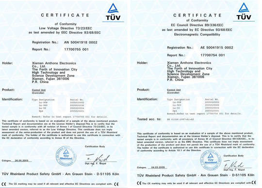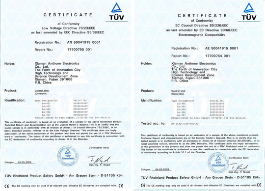 熱烈祝賀廈門安東電子有限公司獲歐盟CE認證(LU-901,LU-902,LU-904,LU-906,LU-907,LU-908,LU-960,LU-50,DP4)